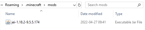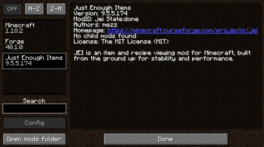 - Tous les mods installés seront affichés dans la barre latérale de gauche, y compris "Just Enough Items" (JEI) que nous avons installé plus tôt.