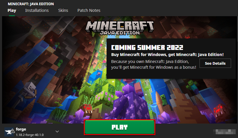 - Ouvrez le lanceur Minecraft, sélectionnez "forge" dans le menu déroulant en bas à gauche et cliquez sur "Jouer".