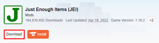 La prochaine étape consiste à télécharger les mods Minecraft. Nous vous recommandons d'utiliser des sites populaires tels que CurseForge ou MinecraftMods. Dans ce tutoriel, nous allons installer "Just Enough Items" (JEI), un excellent premier mod. Ouvrez le site web et vérifiez la version de Minecraft indiquée sur la page du mod - votre jeu doit correspondre à cette version. Une fois cela fait, cliquez sur Télécharger :